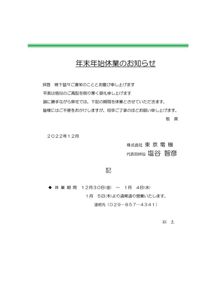 株式会社 東京電機 年末年始休業のお知らせ2022
